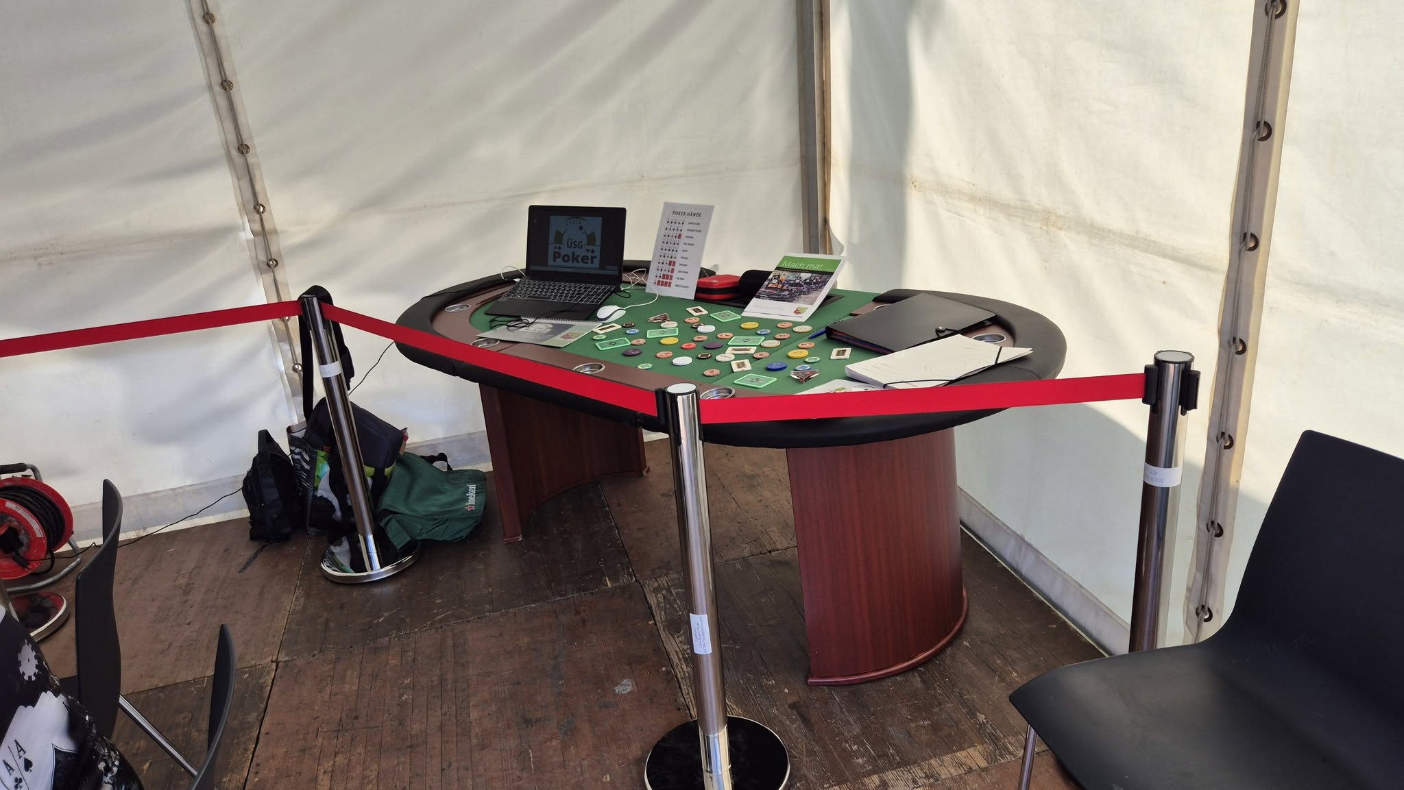 Unsere Sparte präsentierte sich in einem eigenen Pavillon, ausgestattet mit zwei hochwertigen Pokertischen, Claychips, Bulletcards und Bannern, die weithin sichtbar auf unsere Präsenz hinwiesen. Ein Tisch diente als Schaustück mit Chips und Timer, am zweiten wurde aktiv gespielt. Gäste waren herzlich eingeladen, Platz zu nehmen und Texas Hold’em Poker auszuprobieren. Dabei kamen sowohl neugierige Neulinge als auch erfahrene Spieler voll auf ihre Kosten.